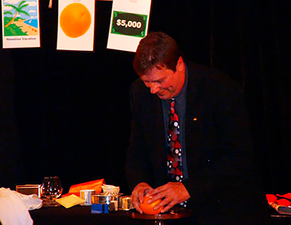 The audience is part of the show! Ran Baker works with your group to select “ideal” volunteers from the audience to assist with his illusions.
